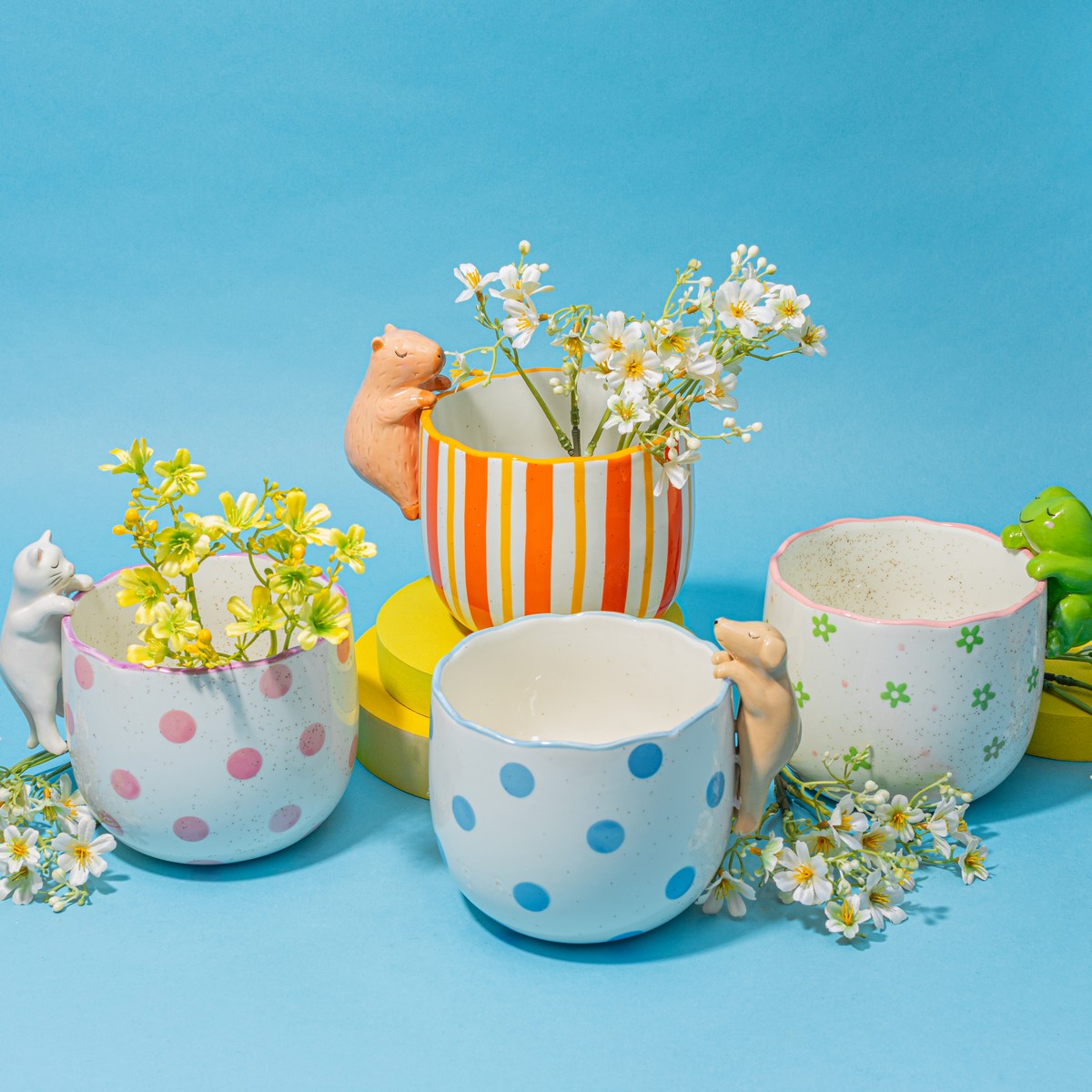 The Peeking Cat Planter is a whimsical planter shaped like a cat peeking out. Ideal for small plants, it brings a playful touch to your home or office space with its cute design.