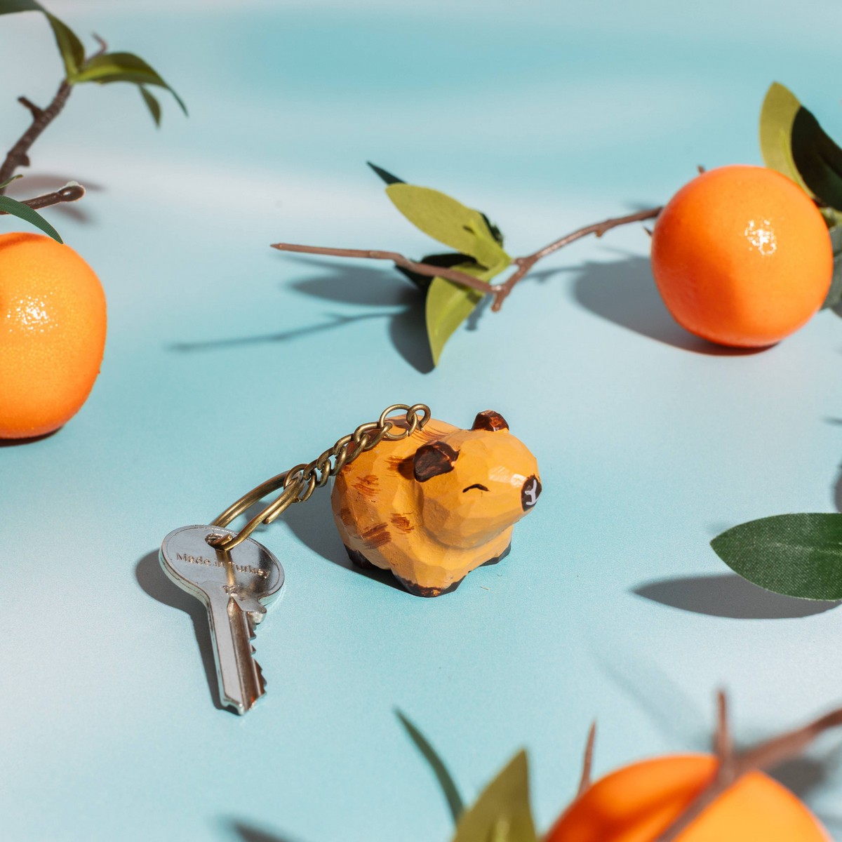 The Capybara Wooden Keyring showcases natural wood craftsmanship in a charming animal shape, offering durability and a touch of nature.